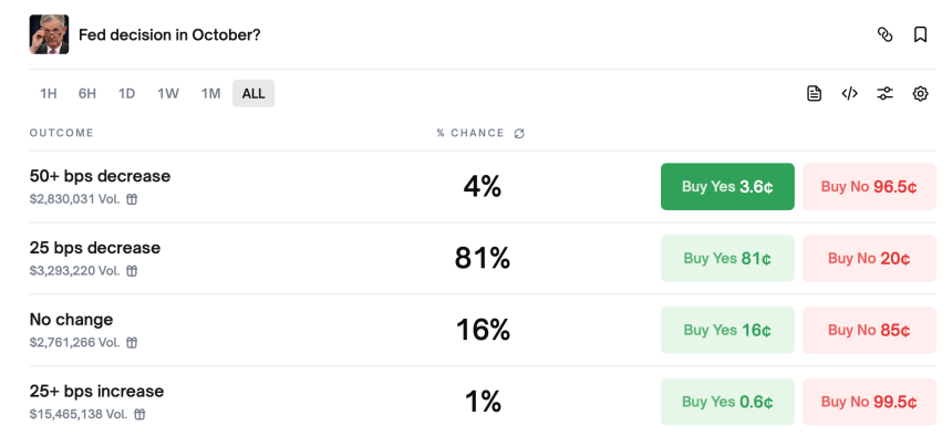 Prediction markets on Sept. 28 rhyme with that view. On Polymarket, traders assign 81% to a 25-basis-point decrease, 16% to no change, 4% to a 50-plus basis-point cut, and 1% to a hike. The markets vibe: the cut is base case, a larger slice is fringe, and tightening is a museum piece. Yes shares hover near 81¢ for the quarter-point line, a tidy shorthand for crowd conviction.