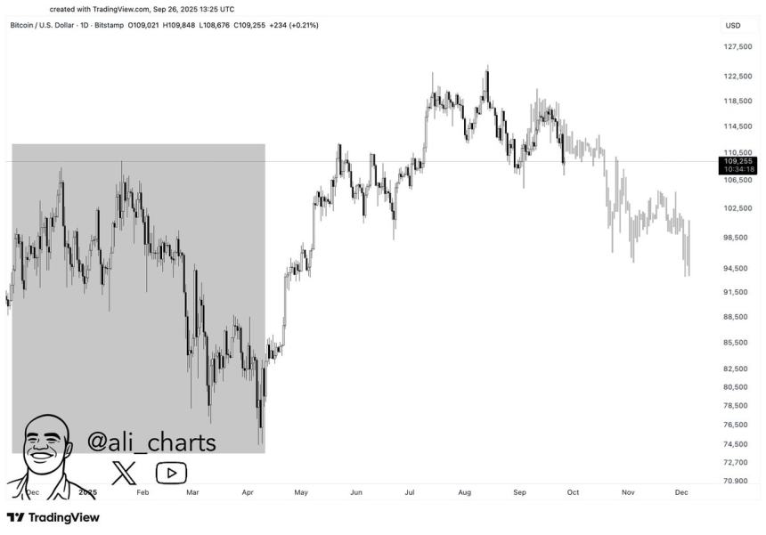 In a new thread, crypto trader Ali Martinez tells his 158,200 followers on X that the top crypto asset by market cap could be following the same trend it did earlier this year, identifying $107,200 as a crucial support zone.