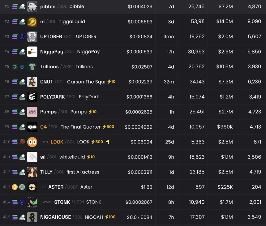 Of the top 15 trending tokens on DEXScreener, four have names that contain racial slurs or allude to skin color. The tokens were all launched on the popular Solana platform, Pump.fun.