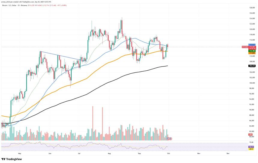 After a period of erratic trading and downward pressure, Bitcoin has successfully pushed back above a critical level, regaining $113,000. This move occurs as Bitcoin surpasses its 50-day EMA, a dynamic resistance that has frequently held back price action in September.