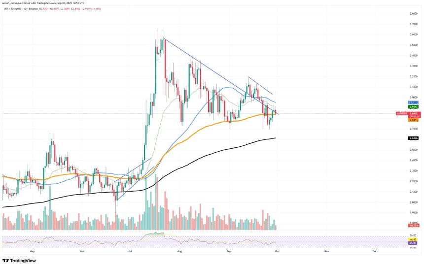 Although XRP has recovered from its September lows around $2.80, the recovery is already beginning to show signs of weakness. The token is having difficulty breaking through a significant technical barrier, the 26-day EMA, which is still acting as overhead resistance despite bulls optimism following the rebound. The recent upward push runs the risk of being little more than a brief relief rally if there is not a clear break above this level.