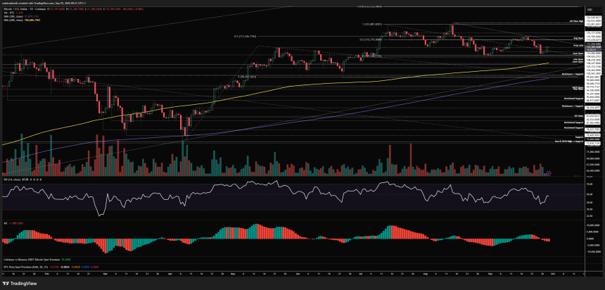 Spot price action remains defined by last week‘s rejection at the August open near $112,000 and a swift slide into the low-$108,000s before a rebound into Sunday’s close. On the weekly timeframe, momentum still tilts higher, but Patel warns that quarter-end, the October turn, and a dense run of data can stretch volatility.