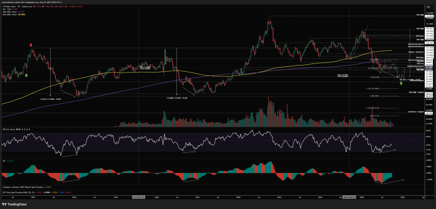 Macro complicates an otherwise orderly technical picture. Patel expects the dollar to overextend before rolling over, a sequence that would support risk later in Q4: last weeks post-FOMC dollar bid is “short-lived,” with DXY “99 as the highest I am expecting,” and a larger move toward 93 in Q4 if momentum breaks down beneath the September open. On equities, he anticipates “a little choppier” October than crypto but still frames dips as opportunities into year-end.