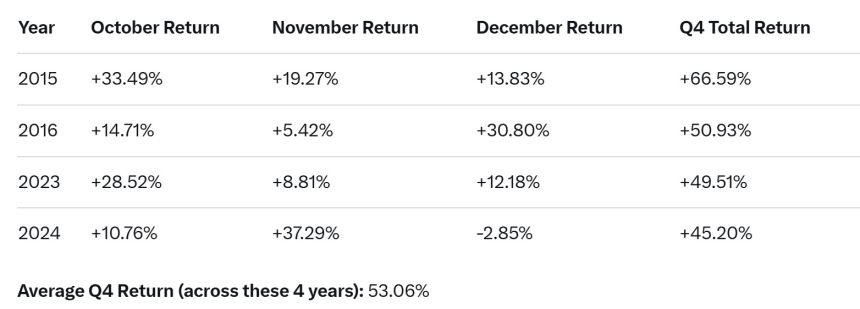 According to data, when Bitcoin closed a green monthly candle in September 2015, 2016, 2023, and 2024, Q4 produced average returns of more than 53%. Breaking it down further, October averaged 21.8%, November 10.8%, and December was down 3.2%, highlighting October as the key ignition point while year-end performance varied.