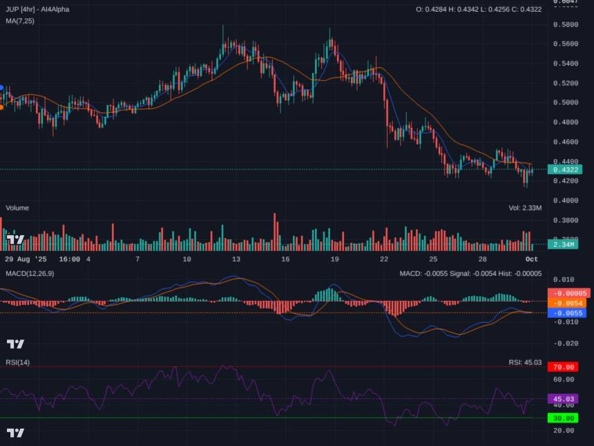 Technically, short-term charts show JUP bouncing slightly from support around $0.41. Moving Averages near $0.44–$0.45 act as key resistance levels. Indicators such as MACD hint at a bullish crossover, while RSI climbs up from oversold territory. This indicates a fair chance of a short-term rebound.