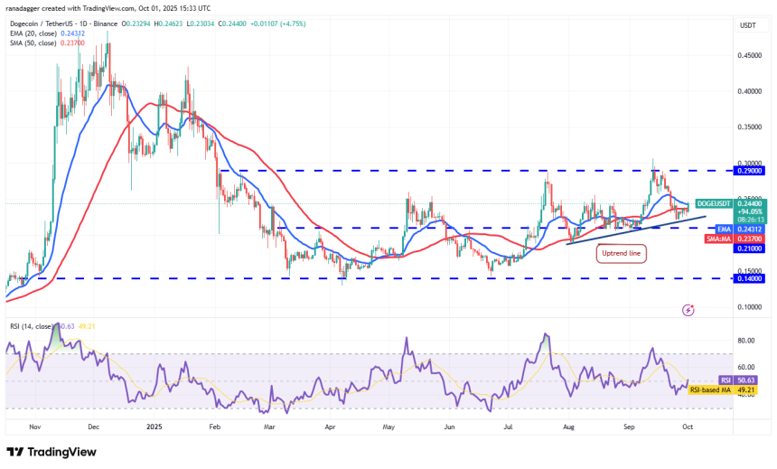 If the price closes above the 20-day EMA ($0.24), it suggests that the bulls are attempting a comeback. The Dogecoin price may rally to $0.26 and, after that, to the stiff overhead resistance of $0.29.