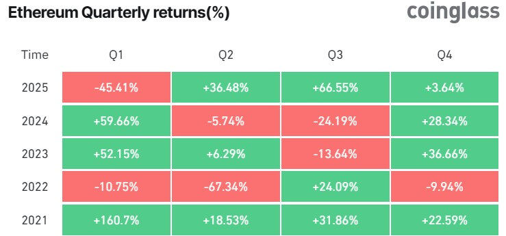According to CoinGlass data, ETH rallied 48.7% in July and 18.8% in August, before losing ground in September with a modest 5% pullback.