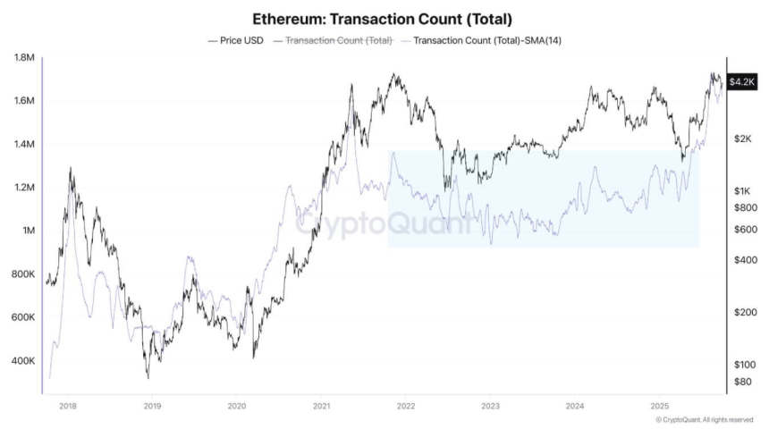 CryptoQuant analyst Darkfrost noted that transaction counts, which hovered between 900,000 and 1.2 million daily over the past four years, have now broken out to record highs of 1.6–1.7 million.