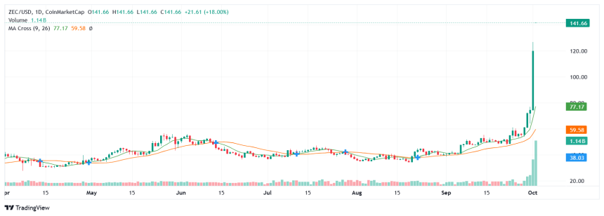 As of this writing, Zcash is changing hands at $146.17, which represents a 61.89% increase in just 24 hours.