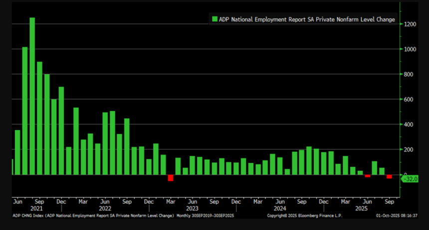 The catalyst came from Wednesdays ADP National Employment Report, one of the critical labour market data points investors were watching. The data revealed 32,000 private job losses in September, well below expectations of a 51,000 gain and marking the steepest decline since March 2023.