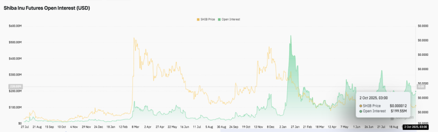 On October 2, SHIB futures open interest stood at $199.55 million, showing steady though cautious engagement. This suggests investors remain active but wary of sharp pullbacks.