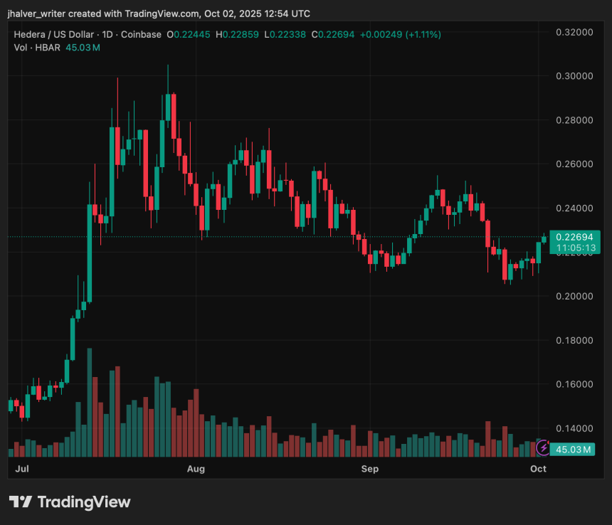 On the daily chart, HBAR completed a double bottom at approximately $0.205 (on September 5 and 26), with a neckline around $0.255.