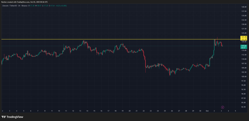 According to analysts at crypto.news, if Litecoin price manages to break past the resistance zone around $121, it could open the door for a run higher. At press time, it was trading slightly below that mark at $117.76 after retesting that level earlier in the day.