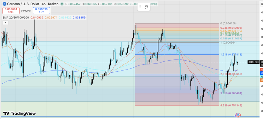 rebounded strongly from the $0.75–$0.78 support zone, showing resilience.Buyers recently pushed ADA toward the 1.618 Fibonacci extension at $0.878, where it faced resistance and pulled back slightly. This rebound reflects growing optimism among traders and investors who closely monitor key technical levels.