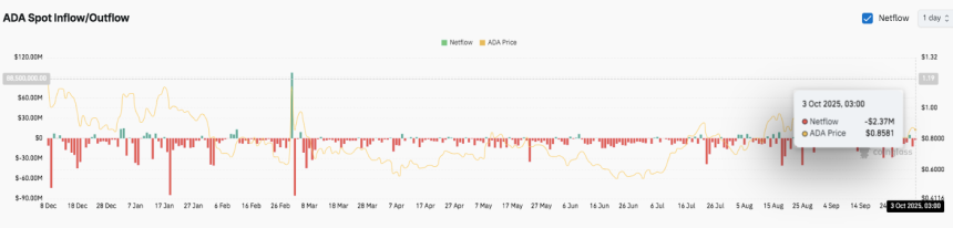Spot inflows and outflows provide further insight. Recent months show persistent net outflows, indicating that investors are moving ADA off exchanges. On October 3, ADA recorded a net outflow of $2.37 million.