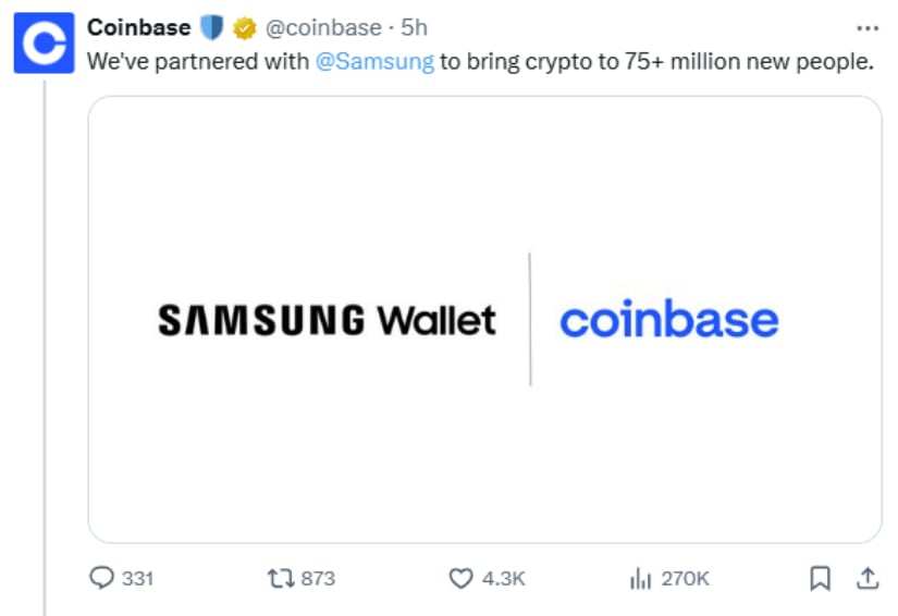 This marks the largest consumer crypto distribution deal Coinbase has completed and represents Samsu