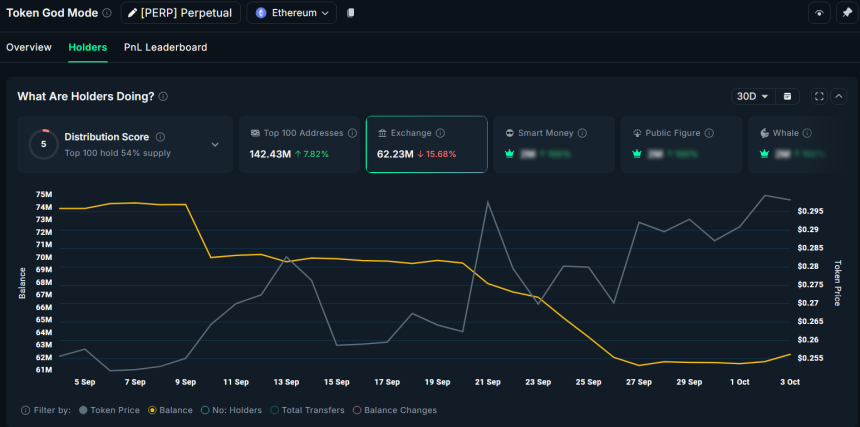 Nansen data shows that PERPs exchange reserves decreased by more than 15.6% in the past month, while balances in top wallets rose 7.8%.