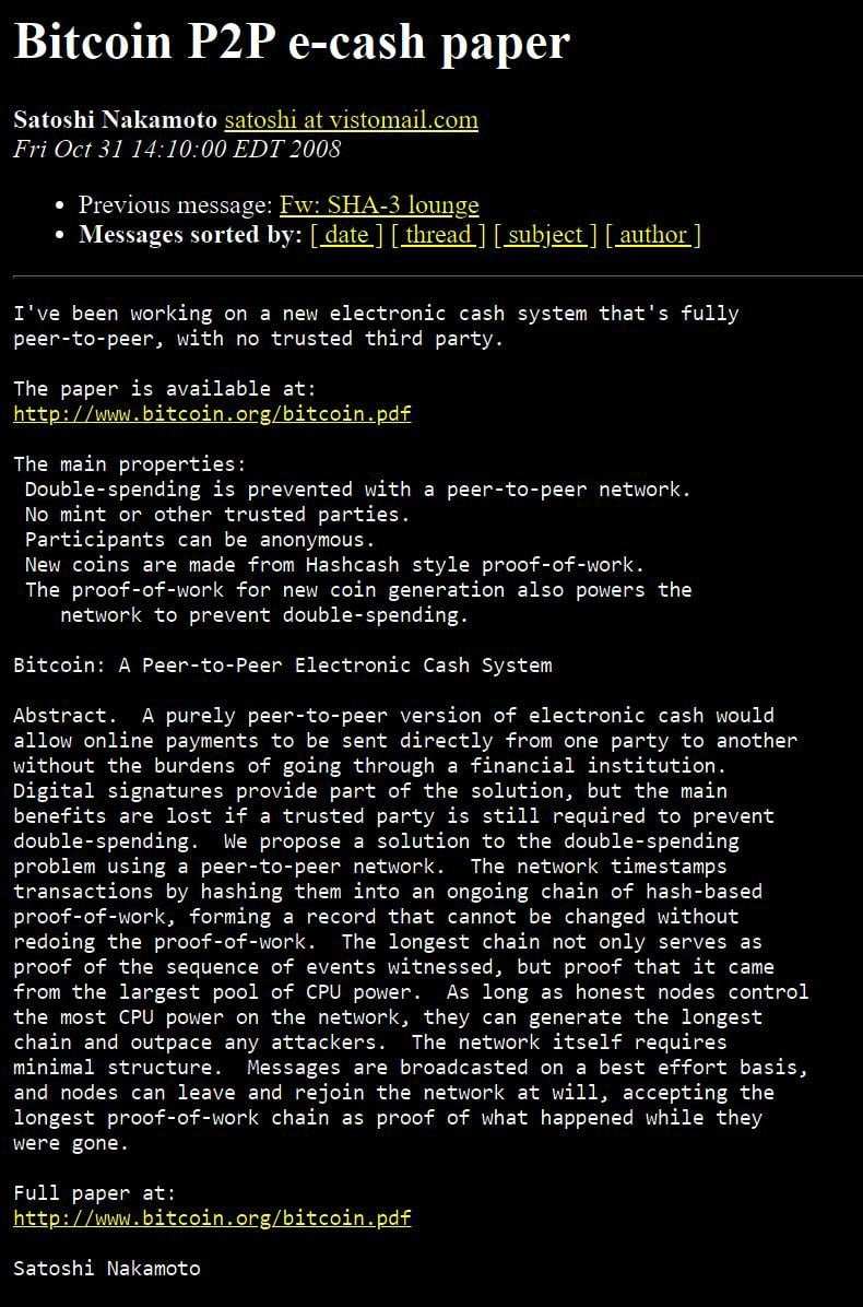 On Oct. 31, 2008, an email from Bitcoin's pseudonymous creator, Satoshi Nakamoto, was sent to a mailing list of cryptography enthusiasts with the subject line, “Bitcoin P2P e-cash paper.” The brief email described a new peer-to-peer digital currency system, which laid the basis of the Bitcoin network.