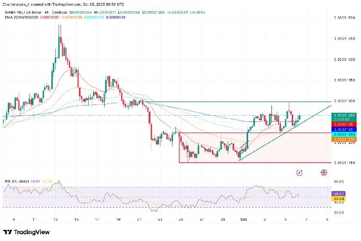 The 4-hour chart shows Shiba Inu price coiling between rising support near $0.00001230–$0.00001240 and horizontal resistance around $0.00001290–$0.00001300. This ascending structure has tightened over the past week, indicating that a breakout is approaching.