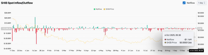 Recent on-chain data from Coinglass reveals a $1.14 million net outflow on October 6, highlighting minor investor withdrawals from exchanges. This comes after several sessions of neutral activity, underscoring the cautious sentiment across the Shiba Inu market.