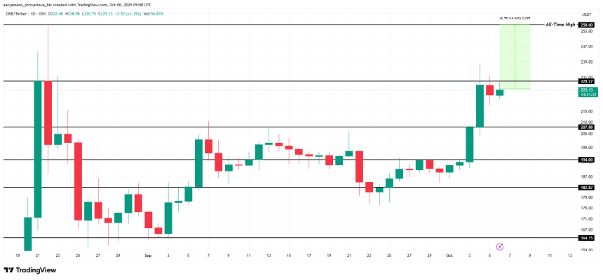 OKB is trading at $225, just below the crucial resistance level of $229. The altcoin has recorded impressive growth this month, climbing from $189 a week ago.