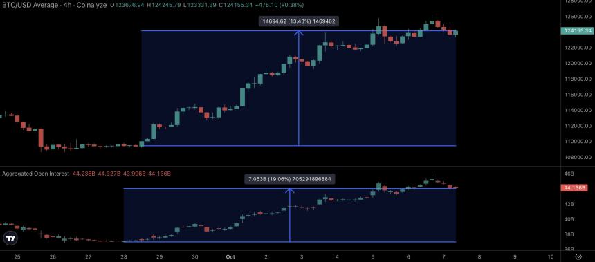 Bitcoin revisited $123,200 after its latest record highs while market analysis raised concerns about surging open interest over the past week.
