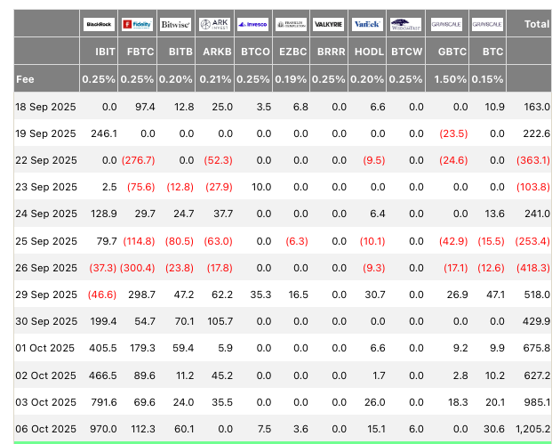 -traded funds (ETFs), posted around $1.2 billion of net inflows Monday, their second-highest daily tally.US spot Bitcoin ETF netflows (screenshot). Source: Farside Investors
