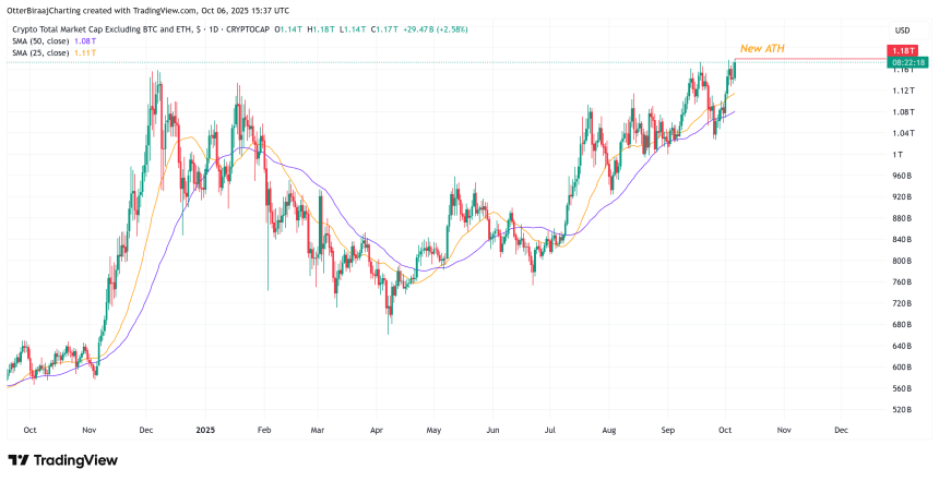 TradingView ticker, TOTAL3, which tracks the market capitalization of all cryptocurrencies excluding Bitcoin (BTC) and Ether (ETH), reached a new all-time high of $1.18 trillion on Monday. The metric also marked its highest weekly close on Sunday, surpassing its peak market capitalization from 2021.