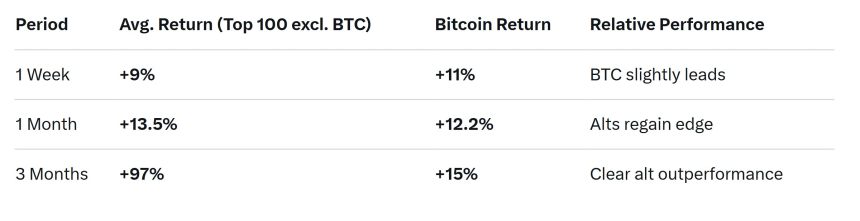 The data revealed a decisive acceleration in altcoin momentum over the past three months, with cumulative returns outpacing Bitcoins by more than sixfold. This shift suggested that while Bitcoin continues to anchor the market, capital is increasingly rotating into riskier assets, which is an indicator of an “altseason” in formation.