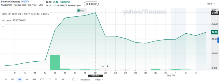 According to Yahoo! Finance, reflecting a volatile tape into early October, aligning with the firms capital raise in September and subsequent treasury disclosures, today its stock prices are near $17.38 with gains of 7%, and since the Solana treasury announcement, there has been an increase in its share that is almost 190%.