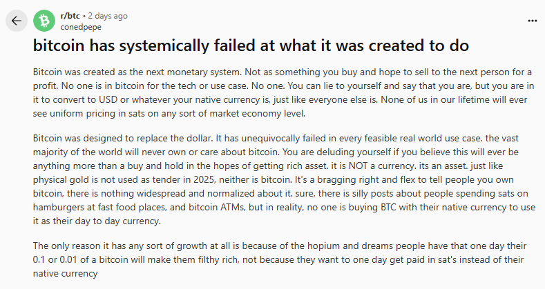Recently, the Reddit Bitcoin community started to debate whether Bitcoin changed its roots. The claim that the cryptocurrency has “systemically failed at what it was” sparked hundreds of comments exposing a divide between those who see Bitcoin as “digital gold” and those who still wish it had become a true currency.