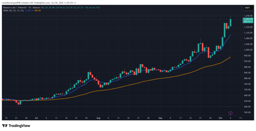 The BNB price continues to defy broader market trends, reaching an impressive new peak of $1,240 to