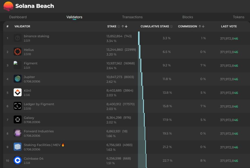 According to Solana Beach, the largest Solana validators are Binance staking, Helius, Figment and Jupiter.