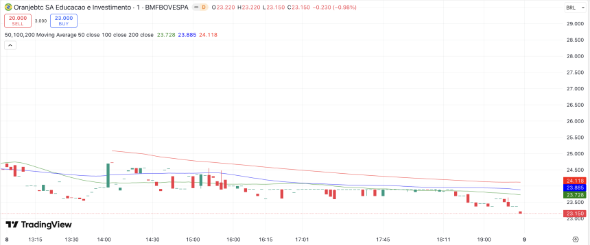 The stock of OranjeBTC opened at $4.35 (23.22 BRL) and saw an early surge, reaching an intraday high of $4.59 (24.50 BRL) as investors reacted to the historic listing. However, momentum faded through the afternoon, and shares closed near their session low at $4.33 (23.15 BRL), reflecting early profit-taking after the initial excitement.