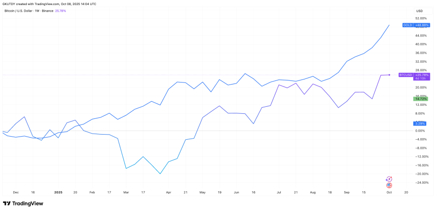 Year-to-date numbers tell a different story as told has been the unexpected outperformer of 2025, rising by around 54%, while Bitcoin has increased by 30%. Therefore, anyone who blindly followed the “digital gold” mantra this year could argue that the original metal is performing better.