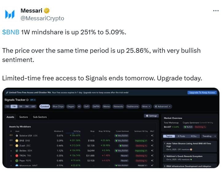 BNB “mindshare” has surged over 250% in just a week, according to Messari, with one analyst pointing to a market shift toward high-throughput, low-cost chains.