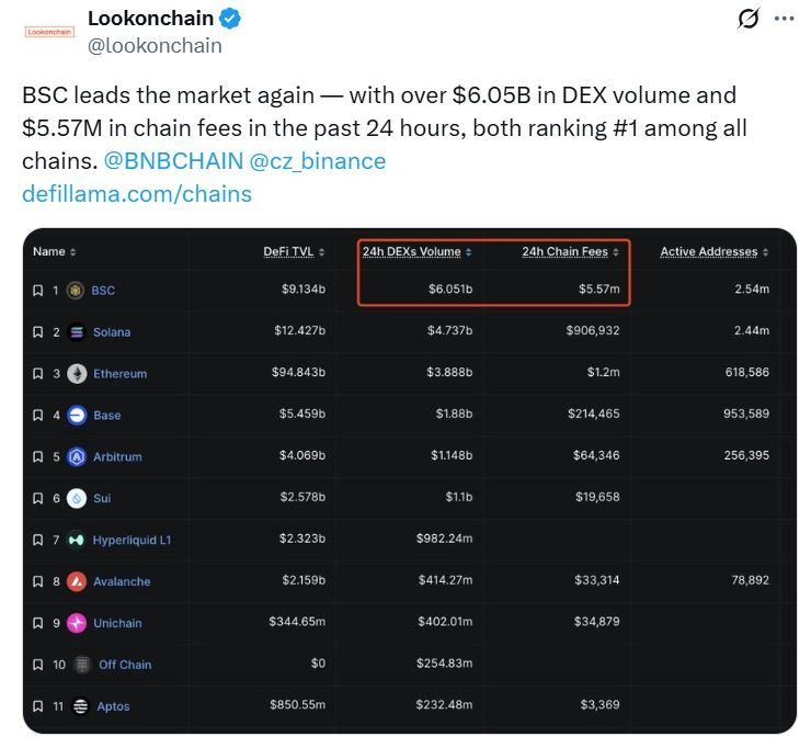 BNB Chain is leading the market in terms of DEX volume, with over $6 billion recorded and $5.57 million in chain fees, according to blockchain analytics platform Lookonchain.