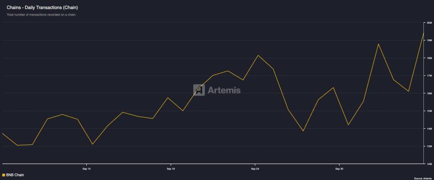 This uptick in user demand is reflected by the chains rising daily transaction count and decentralized exchange (DEX) trading volumes. According to Artemis, the total number of transactions recorded on the BNB Chain over the past month has totaled 19 million, climbing by 41% during that period.