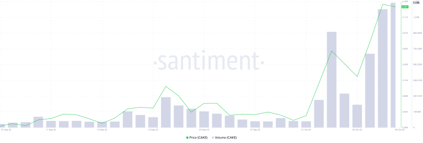 CAKE‘s double-digit surge over the past day is accompanied by a rise in its daily trading volume. As of this writing, CAKE’s 24-hour trading volume sits at $1.71 billion, up more than 60% in the past day.