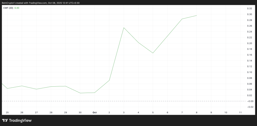 The CMF indicator measures how money flows into and out of an asset. When it returns a value above the zero line like this, market participants favor accumulation over distribution, hinting at further CAKE rallies.