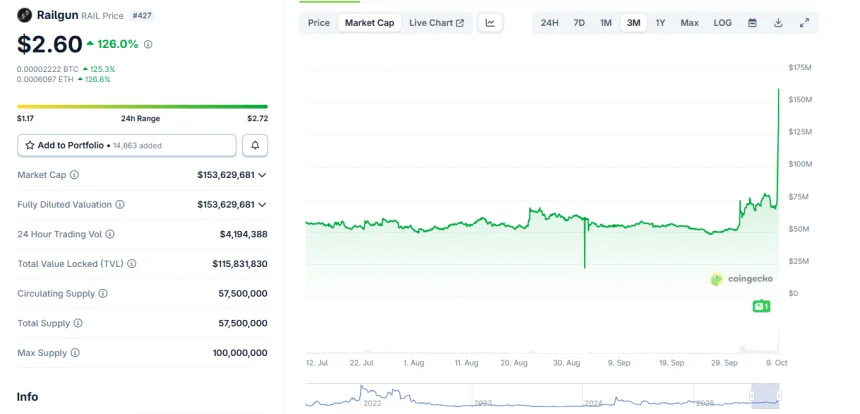 RAIL went vertical as the privacy coin narrative returned, with additional attention from the Ethereum Foundation. | Source: CoinGecko.