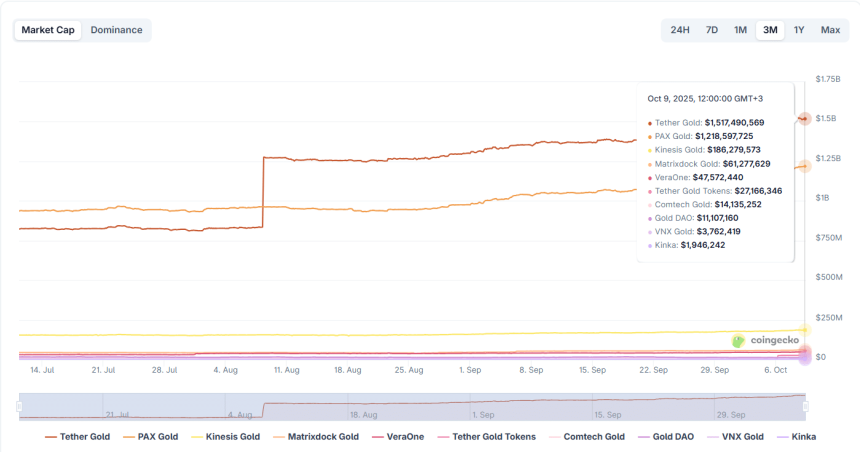 Notably, before the sharp surge in August, Tether Gold had been stuck at a market cap between $0.6 billion and $0.9 billion, although it kept growing steadily. This gradual increase highlighted consistent, albeit slow, adoption among investors seeking a stable asset backed by gold.
