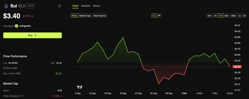 Despite Sui networks surge, its token still lags behind. BeInCrypto Markets data showed that SUIs price has dropped 5.7% over the past month.
