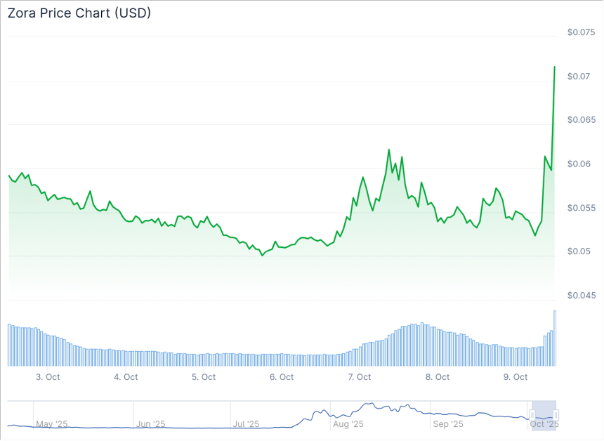 ZORA is up 37% on the day to $.073, or a $314 million market capitalization, following the listing as traders look to frontrun potential retail inflows.