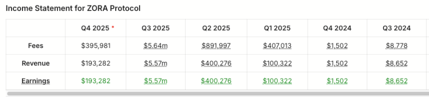 The creator ecosystem pushed Zoras revenues to new highs, generating $5.57 million in Q3 2025, compared to its highly variable previous quarterly revenues that ranged from as little as $1,500 to as much as $1.62 million.