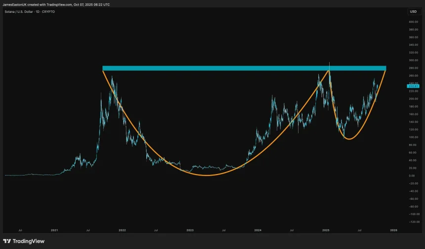 Despite a slight dip in Solanas price to around $218, analysts remain overwhelmingly bullish. Solana Sensei, a popular market analyst, describes the current chart as “absurdly bullish,” highlighting a multi-year cup-and-handle formation nearing completion.