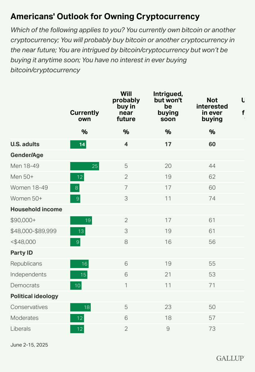 According to a July Gallup poll, 14% of US adults currently own cryptocurrencies, with another 4% reporting that they will likely buy them in the near future.