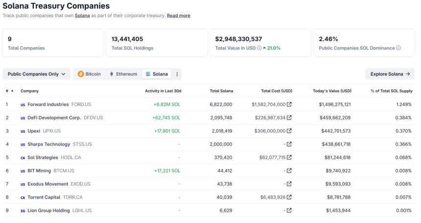 Collectively, Solana treasury companies hold about 2.46% of SOLs supply, worth nearly $3 billion, according to CoinGecko. Only four companies hold more than 0.01%, led by Forward Industries with 1.249%, followed by DeFi Development Corp (DFDV), Upexi and Sharps Technology, each with over 0.35%.