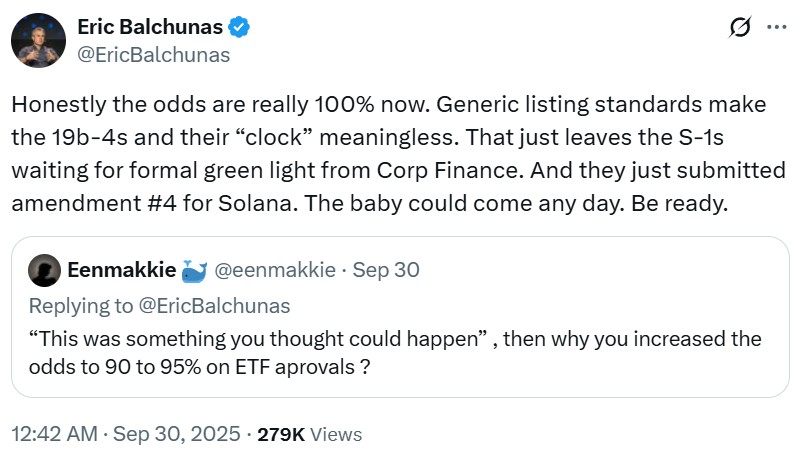 A Bloomberg analyst sees 0% chance that Solana ETFs dont get approved. Source: Eric Balchunas