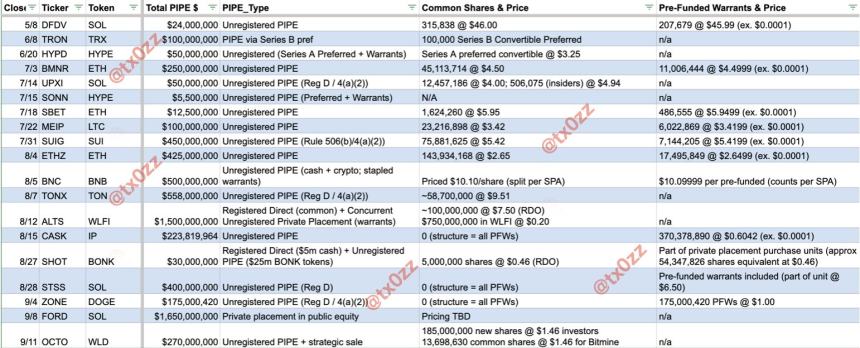 Digital asset treasury private investment in public equity raises across altcoins. Source: Tim Chen